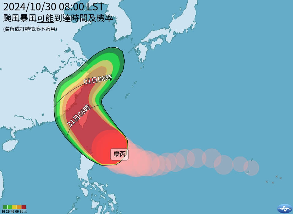 颱風康芮進逼,台灣北北基桃、台中、高雄等全台22縣市晚間8時許陸續宣布10/31周四放颱風假(災防假),停止上班上課。依照《天然災害停止上班及上課作業辦法》第四條規定,風雨達到標準,即可停止上班上課。