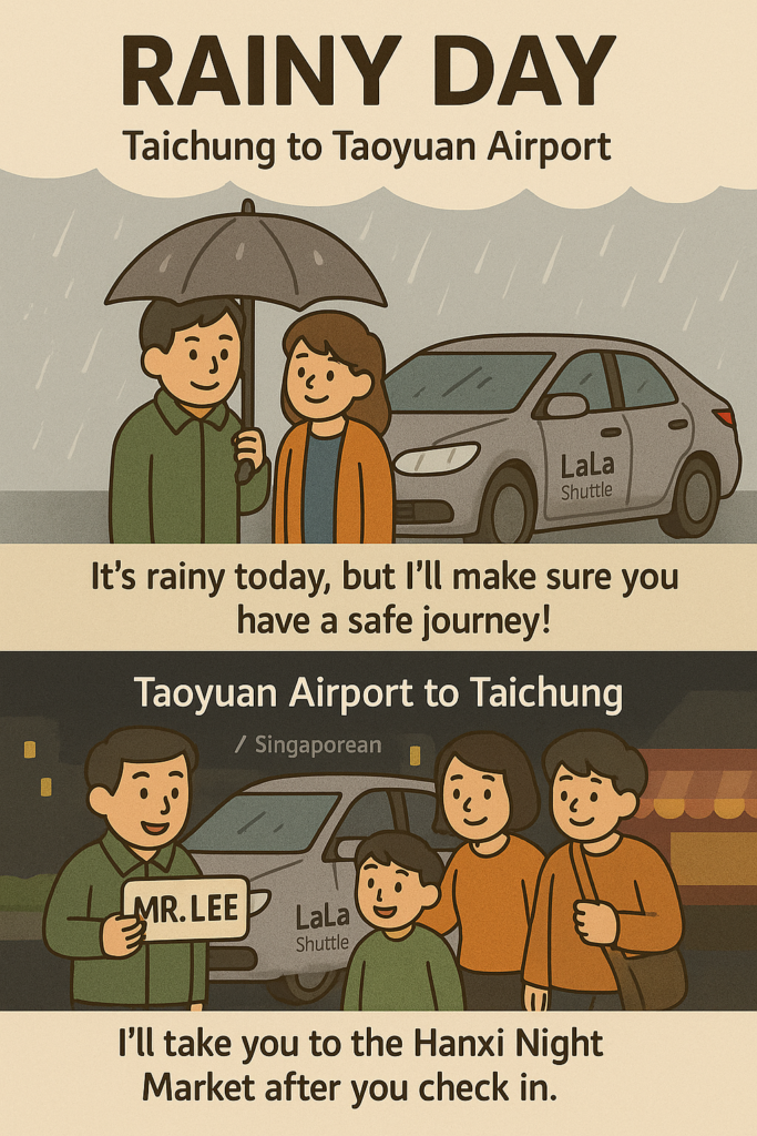 車上放著溫柔的音樂,窗外是模糊的雨景,情侶們低聲交談著即將展開的旅行。小塏一路保持專注,用最平穩的駕駛,陪伴他們安全抵達桃園機場。
